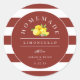 O limoncelo moderno favorece os adesivos. Design, limões e folhas de aquarelas, fundo vermelho e branco de padrão de faixa rústica e linhas de modelo para seu nome e data do evento.