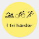 Texto preto e imagens em um adesivo amarelo brilhante, divertido para um triatleta. A legenda "I tri harder" com ícones pictogramas das três disciplinas de triatlo.
