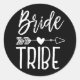 Um adesivo preto personalizável, adaptado à sua tribo de noivas confiável. Ele apresenta um visual clássico de temas preto e branco com as palavras tribo de noiva escrita em letra de estilo manuscrito. Entre as duas palavras está uma seta tribal perfurando um coração.