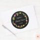 Tulipas e borboletas editáveis Noivado adesivo redondo preto. O design apresenta uma bela coroa de tulipas rosa, amarelas e laranja em um fundo preto. Uma borboleta rosa e amarela brinca ao redor das tulipas, realçando a estética alegre com um toque caprichoso! Use como selo de envelope em seus convites de noivado e convites temáticos florais! Personalize o texto e altere o estilo e a cor da fonte para combinar. Reposicione e remova o texto usando a ferramenta de design, se necessário.