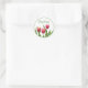 Este adesivo redondo apresenta um nome bonito escrito em verde sobre um conjunto de flores de tulipas vermelhas com uma borda circular inserida em verde escuro.