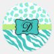 Você encontrará muitos usos para este adesivo personalizado com seu monograma inicial e combinado com zebras coloridas e peles de leopardo ou de chita. Este sofisticado aqua turquesa na moda e colorido, azul-lacrimogêneo e zebra branca e padrão de impressão leopardo está disponível em várias combinações de cores. Um emblema azul-azul-turquesa está em uma tira de verde limão para criar uma área de personalização com seu monograma. Este design gráfico é uma das tendências mais quentes de arte e design, e é extremamente popular de moda a decoração doméstica. Isso é totalmente personalizável. Vai à loucura com estas designs de pele selvagem!