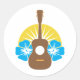 Um ukulele estilizado, sentado sobre um fundo de flores de Hibiscus sobre um semicírculo de explosão solar.
