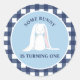 Alguns adesivos de festa de aniversário de gingham azul de primavera de primeiro aniversário do Bunny.