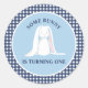 Alguns adesivos de festa de aniversário de gingham azul de primavera de primeiro aniversário do Bunny.