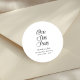Adicione um toque final sofisticado aos detalhes do fim de semana do seu casamento com este Adesivo Redondo Clássico para Jantar de Rehearsal Moderno e Elegante "One Day Away". Projetado com uma tipografia minimalista limpa e um layout atemporal, este adesivo elegante aprimora a embalagem de brindes, bolsas de boas-vindas, envelopes e garrafas de bebida com sofisticação sem esforço.