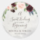 Felicite seu evento de casamento rápido com um final doce para um novo adesivo clássico de casamento. O design apresenta lindas flores rosa, pincéis, azuis, marinhos e burgundy pintadas manualmente com folhas verdes, bem agrupadas em buquês elegantes para embelezar seus cartões de convite para eventos.