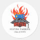 Vestido e moderno adesivo de festa de formatura com ilustração de um boné de formatura flamejante. O texto diz "um grau mais quente".