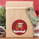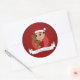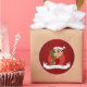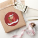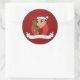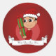 Um adesivo redondo com ilustração de um bonito sorridente rapaz hispânico/latino ou bebê asiático, ele está vestindo um chapéu de Papai Noel vermelho e branco e segurando um presente de Natal; com um modelo de texto editável para seu nome ou mensagem, um design de Natal com fundo vermelho