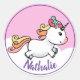 Um adesivo de pastel com nome, com um unicórnio gordinho e giro numa nuvem.