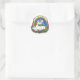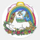 Um unicórnio cumprimenta o pássaro azul da felicidade sobre o arco-íris em uma terra brilhante de paz e abundância.
