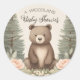 Este adorável design de floresta florestal apresenta um urso marrom giro cercado por florais e árvores.