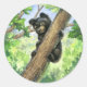 Um filhote de urso aventureiro pende de um membro da árvore na floresta. Pintura de aquarela e guache por Amanda Diehl