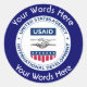 Este adesivo personalizado é decorado com o escudo USAID da Agência dos Estados Unidos para o Desenvolvimento Internacional, que pode ser personalizado com uma escolha de palavras acima e abaixo que lhe permite personalizá-lo com o nome de uma pessoa, local, posição etc.