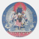 Vajrasattva e Consort Thangka pintaram 2011 por ariya entre fevereiro e maio de 2011 (cerca de 200 horas) em Gokarn/Índia. Vajrasattva (Tib. Dorje Sempa), o "ser ou herói indestrutível", é um bodhisattva nas tradições budistas de Mahayana, Mantrayana e Vajrayana. O nome de Vajrasattva significa Diamond Mind ou Thunderbolt Mind. Ele é bonito e pacífico com um rosto e dois olhos doçamente sorridentes, e ele se senta na postura de vajra sobre um disco de lua branca e um lótus multicolorido. Com a mão direita, abraça o seu consórcio, conhecido ou como Vajratopa (Tib. Dorje Nyenma), ou Vajragarvi, a dama do "vajra-orgulho". Vajrasattva segura uma vajra de cinco pontas (dorje) ouro em frente ao seu coração, e com a mão esquerda descansando sobre a coxa, segura um sino prateado (ghanta) ascendente no nível da anca. No budismo trítico (Vajrayana), a vajra e o sino são usados em muitos ritos por um lama. O dorje é um símbolo masculino que representa muitas coisas para a tantrika. A vajra é representativa da compaixão, enquanto a sua ferramenta companheira, o sino que é um símbolo feminino, denota sabedoria. Algumas divindades são mostradas segurando cada vajra e sino em mãos separadas, simbolizando a união das forças da sabedoria e da compaixão, respectivamente. Vajrasattva é uma importante divindade Adi-Buda e Yidam, cuja prática é particularmente eficaz na purificação de todos os depoimentos, especialmente os de raiva e aversão. A sua prática de meditação visual e a repetição do seu mantra de cem sílabas constituem uma das quatro "práticas preliminares" comuns a todas as escolas do budismo tibetano. Mantra Além da prática pessoal, o mantra de Vajrasattva é considerado capaz de purificar o carma, trazer paz e causar atividade iluminada em geral. O mantra de seis sílabas (OM VAJRASATTVA HUM) é uma versão menos formal do mantra de cem sílabas em que se baseia, mas acredita-se que contenha os pontos espirituais essenciais do mantra mais longo.