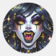 adesivos de Halloween. Vampiro feminino com olhos dourados e dentes e brilhas no cabelo. presas Douradas, pele clara. Legal para o Halloween ou qualquer um que ama vampiros.