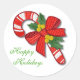 Bonito adesivos decorativos, com gráficos de uma cana decorada feita para se parecer com bordado. Feriados felizes no texto de script verde é totalmente personalizável para ler o que você deseja. Excelente para uso como selagem de envelopes para seus cartões de cartões de natal e convites.