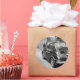 Um autocolante fotográfico redondo de um velho e antigo carro FIAT 500 numa rua numa cidade de Itália, a na moda preto e branco.