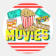 Uma coleção de itens temáticos do filme incluindo pipoca, 2 copos de refrigerante, 2 ingressos de filme e 2 doces. O texto colorido diz: "Vejo você no cinema". Presente ideal para qualquer fã de cinema! Esta design não pode ser copiada ou utilizada de nenhuma forma sem o consentimento escrito deste compro.