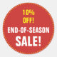 Este design de adesivo redondo apresenta as mensagens "END-OF-SEASON SALE!" e "10% OFF!". Pode ser usado em uma loja de varejo para marcar que um item está em venda. O valor do desconto pode ser personalizado.
