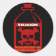 Garrafa com crânio e ossos cruzados diz "Religião" e por baixo "aviso: o uso habitual causa ódio, intolerância e guerra interminável."