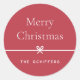 Termine suas mensagens e presentes de Natal com esses doces e simples adesivos de Natal, personalizáveis com seu cartões de natal e assinatura familiar preferidos (mostrados com "Feliz Natal") em um fundo vermelho. Um pequeno arco que corre pelo centro completa este elegante design de feriado minimalista.