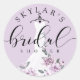 Adesivo elegante, sofisticado e moderno de chá de panela de noiva com jardim floral de lavanda. O design apresenta nosso vestido de noiva branco transparente, chic, elegante e moderno pintado à mão com um jardim botânico de rosas e flores de lavanda em flor. O vestido floral está pendurado em um cabide de vestido vintage ornamentado. Detalhes de renda de flores suaves e elementos cintilantes no vestido de noiva criam um visual lindo, sofisticado e luxuoso. Tipografia de caligrafia estilo script linda "Noiva". Todas as ilustrações contidas neste adesivo de chá de panela de noiva com vestido de noiva floral elegante são obras de arte originais desenhadas à mão por Moodthology Papery.