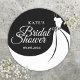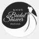 Um adesivo de favor de chuveiro de noiva chique com um vestido de noiva elegante em um fundo preto com um texto branco em caligrafia bonita para os detalhes do seu chuveiro de noiva especial. Você pode personalizar a cor do fundo para combinar com o tema do seu casamento. Criado por Thisisnotme©