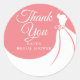 Vestido elegante rosa pêssego chá de noiva, obrigado adesivo redondo clássico com um lindo vestido de noiva, texto em caligrafia bonita e todos os detalhes do seu chá de noiva personalizados em texto chique. Você pode personalizar a cor do fundo para combinar com o tema do seu casamento.