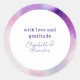 Este adesivo apresenta uma bela mistura de púrpuras, azuis e pinks em um design de aquarela macia. Com tipografia limpa e contemporânea, ela combina perfeitamente elegância artística e um toque moderno para seu dia especial.