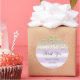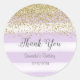 Tinta redonda para o favor de aniversário com brilho dourado falso e fundo de listras roxas.