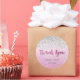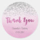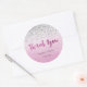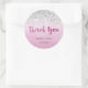 Adesivo redondo em favor da festa de aniversário com falso brilho prateado e fundo cor-de-água cor rosa ombre.