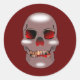 A design mostra a pintura digital de um crânio resgatado com alguns dentes deixados em sua boca e buracos vermelhos para olhos e nariz. O design é colocado sobre um fundo vermelho escuro. Você pode mudar facilmente a cor do fundo e / ou adicionar suas próprias palavras clicando no botão "personalizar".