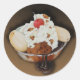 Uma tigela de vidro de sorvete de chocolate com bananas, chicote, nozes e cereja.