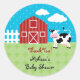 Etiqueta de chá de fraldas, branca e colorida, com um tema de fazenda. Possui animais de fazenda carinhosos, um celeiro vermelho, árvores e uma cerca colhida sobre um fundo verde brilhante e azul bolinhas. Use-o para selar envelopes ou favoritos para festas. Adicione a sua própria redação.