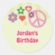Excelente do adesivo para a festa de aniversário de uma jovem. Apresenta ícones típicos dos anos 70, como o sinal de paz, a flor e a estrela. Excelente design colorido e fofo para um evento divertido. Use-o para favoritos para festas ou selar envelopes. com