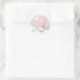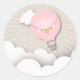 Um adesivo com ilustração de um balão de ar quente cor-de-rosa flutuando sobre as nuvens com fundo de explosão solar. Personalize o texto. Convites de festas de aniversários correspondentes estão disponíveis na Paperie de Jill.