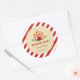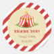 Adesivo redondo para festa de aniversário com design de tenda de circo e combinação de cor vermelha.