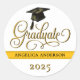 Vinheta de Graduação de Script Elegante. Apresentando um boné de formatura sobre um script de ornamentado "Formando" em ouro com uma "sombra de queda" preta. O nome dos formandos em preto numa fita colorida sobre o adesivo. O ano no fundo do autocolante é personalizável, assim como o nome. PS: A cor da fita ou do fundo inteiro pode ser alterada a dentro da ferramenta design para corresponder ao seu tema de cor. Este é um adesivo versátil e pode ser usado como uma "assinatura" ou elemento especial em sua correspondência de e-mail, bolsas de favor, notas de agradecimento ou outros. Faça disso um marco para se lembrar com um futuro brilhante e excitante com oportunidades futuras.