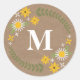 Um adesivo com ilustração de margaridas, suspiros de olhos negros e verde. Personalize no centro. O fundo é de papel marrom inspirado. Procure por convites de casamento e mais na Paperie da Jill.
