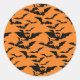 Um adesivo em forma redonda, mostrado em laranja com um impressão de morcegos de Halloween. Personalize este item ou comprar como está.