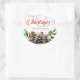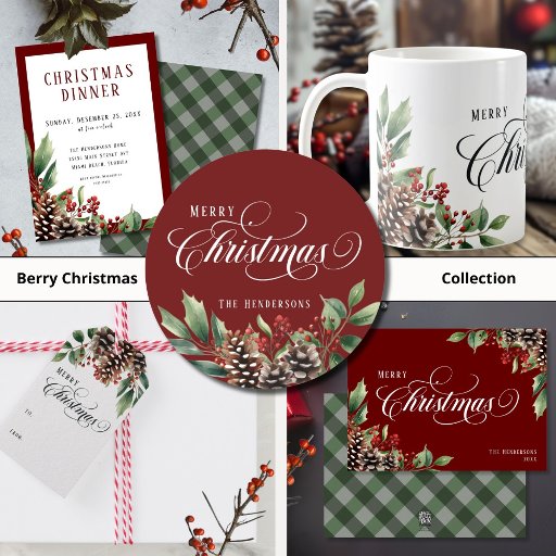 Vinheta de Natal com Tipografia de Nome Personalizado. Com uma cor de base branca e uma Decoração de Natal com uma cor-de-água com bagas vermelhas, verde e cones de pinho. Uma fonte vermelha brilhante no centro do autocolante dizendo Natal. Adicione o texto personalizável e o nome da família no mesmo vermelho. Este adesivo de Natal tradicional é versátil com muitos usos. Adicione a sua oferta como parte do empacotamento e da etiquetagem, adicione ao seu correio e envelopes, adicione sacos de presentes ou outros. É opcional ter o nome da família. Fácil personalizá-lo para seu nome de família ou excluí-lo. Veja os outros produtos correspondentes nesta coleção para um tema coeso.