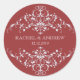 Os ornamentos antigos românticos em branco contra fundo vermelho profundo servem como uma estrutura para este adesivo. Personalize-o completamente com o(s) seu(s) próprio(s) nome(s) e data do evento. Coloque em envelopes ou correspondência, sele bolsas, caixas de etiquetas, etc. Um autocolante adequado para qualquer ocasião: casamentos, festas de noivado, uma data de salvamento ou um evento corporativo. Disponível em cores alternativas com cartões, favores e postagem correspondentes.