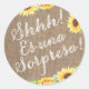 Fundo de efeito de renda em burlap com girassóis alegres. Os autocolantes têm "Shhh! É uma surpresa!" texto. Se quiser um texto diferente no autocolante, por favor, envie-me uma mensagem! Si quiere que la pegatina diga algo diferente, mandeme un mensaje!