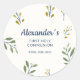 Celebre um dia especial com este adesivo floral minimalista. Folhas suaves e padrões de ramificação enquadram texto editável para nome, data e "Primeira Comunhão", criando uma delicada e personalizada manutenção perfeita para convites, favores ou decorações.