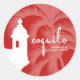 Etiqueta de coquito de Porto Rico com palmeiras em fundo vermelho.