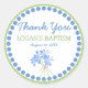 Doce design do adesivo do batismo. Uma fileira dupla de pontos azuis e verdes borda este adesivo bonito. Um pequeno buquê de flores silvestres azuis está no fundo. O texto diz obrigado, então o nome e batismo da criança e a data do batismo. Está no mesmo verde e azul que os pontos. Fácil de personalizar.