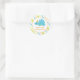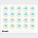 Este bonitinho adesivo de dinossauro tem um fundo laranja, verde e de listras azuis. No meio, há um círculo com um dinossauro azul com um chapéu de festa na sua cabeça. Abaixo do dino, você pode facilmente personalizar o texto!