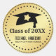 Um adesivo de graduação de ouro personalizado começa com um boné de formatura com uma estrela de ouro no centro. A classe de 2018 está escrita abaixo. O nome do formando e depois a sua escola segue. Uma fileira dupla de pontos enquadra a tipografia. A fileira interna de pontos é maior e a fileira externa de pontos pretos é menor. O plano de fundo ouro suave ficará excelente em envelopes brancos ou em qualquer favor da parte colorida.