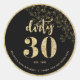 Etiqueta de favor de festa redonda de aniversário preto e dourado "Sujo 30" personalizada para com padrões simples, letra de escrita manual simulada e escrita por script. Personalizado com nome, ano de nascimento/data de nascimento ou mensagens curtas da sua.